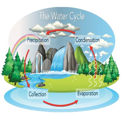 flows into the ground. This process of water moving from the earth into the atmosphere and back to earth again is called the water cycle.
